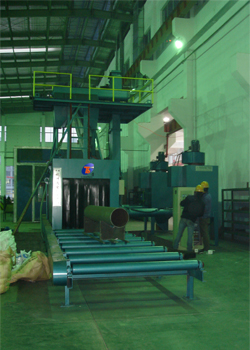 我公司設(shè)計制造的通過式拋丸機已調(diào)試完成,通過驗收投入使用;它能夠?qū)μ幱谠紶顟B(tài)的鋼材表面施以強烈拋丸,清除其銹斑和焊渣及氧化層;