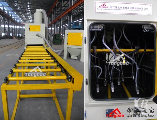 左圖為噴砂處理工件入口輸送滾軸平臺,右圖為設(shè)備內(nèi)部工作艙結(jié)構(gòu)